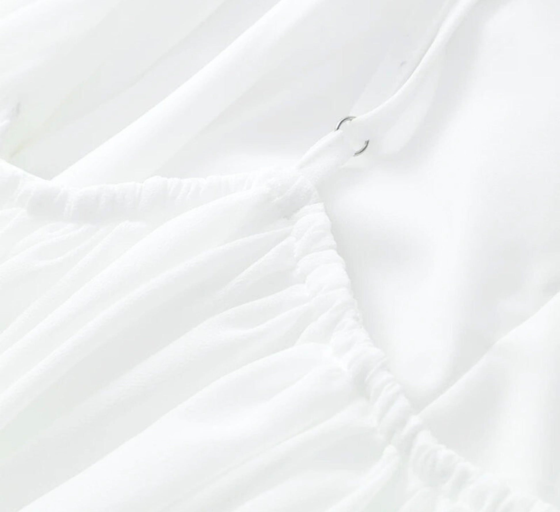 Crafted from white mesh material, this backless mini dress embodies feminine charm. Designed for the confident woman, it features a flattering V-neckline, delicate mesh, and a bold backless design.