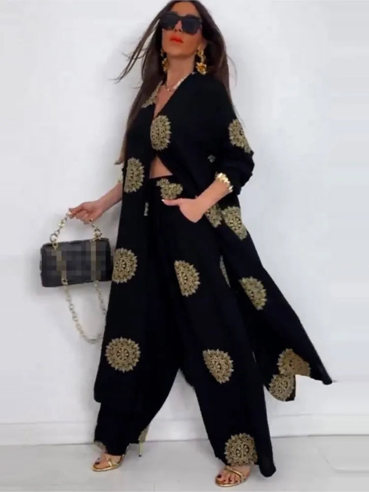 Step into timeless elegance with the Layla Gold Essence Set. This two-piece ensemble features a flowing longline robe paired with wide-leg trousers, crafted in a lightweight ivory fabric adorned with intricate golden medallion patterns. Whether you're attending a special event or enjoying a luxurious day out, this set blends modesty, sophistication, and effortless style.